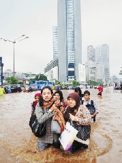 1月17日,人们在印度尼西亚首都雅加达涉水前行。当日,由于连续多日的暴雨,印度尼西亚首都雅加达市区河水暴涨,许多地区遭水淹。在过去两天,已经有50多个街区遭水淹,超过2万家庭住房进水。 新华社发