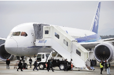 1月17日,在日本香川县高松机场,日本运输安全委员会成员视察头一天紧急迫降的波音787飞机。 新华社发