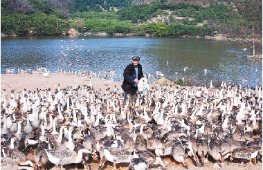 1月17日,建德市梅城镇养殖大户蒋志祥正给大雁喂食。春节将临,经过6个多月饲养的大雁,销路看好。 宁文武 摄