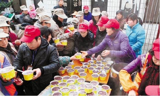 1月19日,温岭市义工熬制了500多份腊八粥,送给环卫工人品尝。