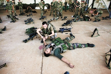 1月14日,在马里巴马科空军基地,一名法国士兵躺在地上接受急救训练。