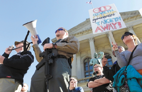 1月19日,在美国佐治亚州首府亚特兰大,一名控枪对策反对者拿着AR-15自动步枪参加抗议集会。 新华社发