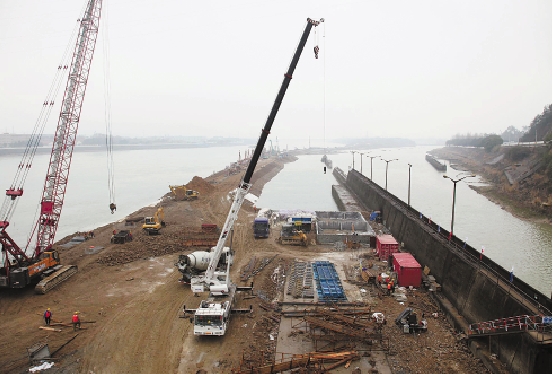昨日,富春江船闸扩建改造工程完成大江纵、横向围堰土石方填筑。 何小华 摄