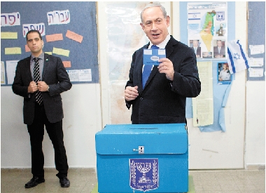 1月22日,以色列总理内塔尼亚胡(前)在耶路撒冷的一处投票站准备投票。