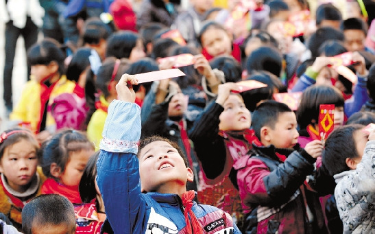 1月23日,丽水青田万阜乡学校的283位学生都领到了100元压岁钱,给学生们零花或用于购买学习用品。压岁钱是“圣奥志远万阜教育基金”送给孩子们的礼物,基金还将专门资助万阜乡家境贫困的学生。 本报记者 梁臻 摄