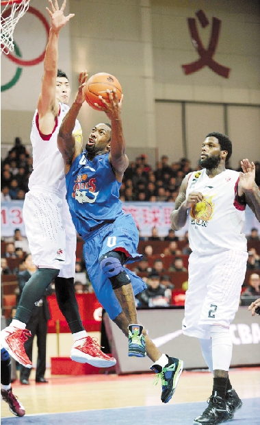 稠州银行队丁锦辉(左)在阻止上海玛吉斯队球员阿里纳斯(中)上篮。