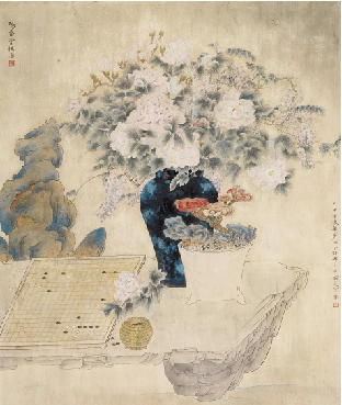 | 阳春会棋图(国画) 张东华 作 弈棋和品茗、读易、行旅一样,在我国传统的图像符号里,表现出来的往往是在山水之间、修竹之旁、茅屋之内抑或清流之侧。二三耄耋老人或俯或仰,或思或虑,偶尔会有一二位垂髫稚童在旁煎炉烹茶。画面间飘散出一种淡然无为、怡然自得的况境。中国美术学院博士张东华先生的阳春会棋图诠释的似乎是另一种氛围,以精细的笔墨,工谨而突出地绘出盛开的牡丹、穿插在花瓶中的紫藤和盆栽的灵芝。尤其是光滑平整的岩石上了无弈者的棋盘更引人遐思。显然,主攻花鸟的张东华先生这一看似无心之举,不经意间成就了画外之旨,宛如王维“空山不见人,但闻人语响。返景入深林,复照青苔上”所表达的诗境。 (应霁民) |