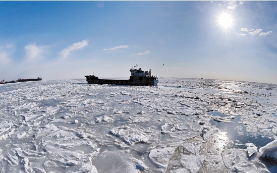 1月24日,一艘轮船在已结冰的秦皇岛海域航行。当日17时,国家海洋局北海预报中心发布的消息,受冷空气影响,近日渤海海域海冰明显加重,其中辽东湾浮冰范围63海里,海冰最大冰厚40厘米,分布面积17665平方公里,占辽东湾海域面积的57.73%,22日、23日已连续两天发布海冰蓝色预警。 新华社记者 杨世尧 摄 |