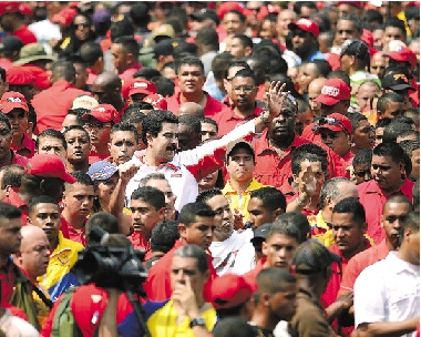 1月23日,在委内瑞拉首都加拉加斯,委内瑞拉副总统马杜罗(中)与查韦斯的支持者们参加一次集会。 新华社发