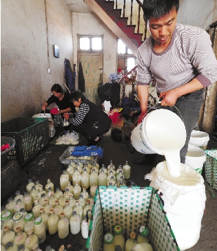 洪明更将刚挤出的鲜奶,过滤分装后,售给顾客。