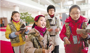 1月25日,来自浙江在线小记者团的孩子们在省十二届人大一次会议现场采访人大代表。 本报记者 黄曙林 李震宇 摄