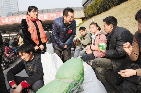 1月26日,省政协委员韩文红(女)、胡慧璋前往杭州火车站,看望返乡民工,征求解决买票难的意见和建议。 本报记者 胡元勇 吴元峰 吴煌 摄
