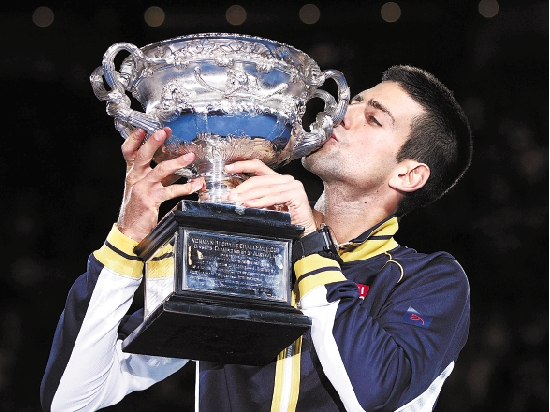 右图为德约科维奇在颁奖仪式上亲吻奖杯。 新华社发