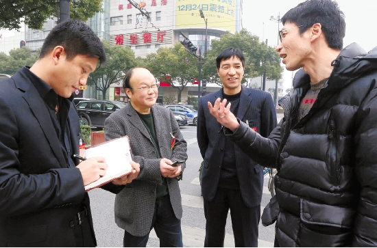 1月27日,省人大代表冯耀忠(左二)、韩金波(左一)、莫红强(右二)利用休息时间,走上杭州街头,就堵车等问题听取市民的想法与建议。