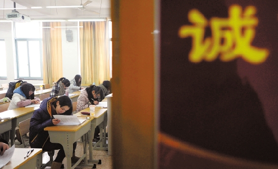 1月9日,在杭州师范大学的一个“诚信考场”内,学生正在进行考试。杭州师范大学在期末考试期间推广“诚信考场”。考场内不设监考老师,老师只负责试卷的分发和回收,考场内则依靠学生的自我约束。 新华社记者 鞠焕宗 摄