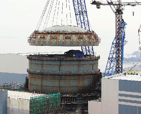 三门核电1号机组顶封头正在吊装。 台州日报记者 杨辉 通讯员 陈莹 摄