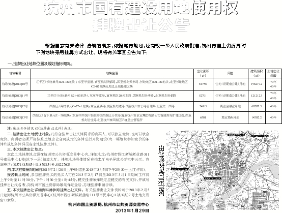 五、本次挂牌出让详细资料请参阅挂牌出让文件。有关挂牌出让文件资料可于2013年2月5日起到杭州市公共资源交易中心(杭州市钱江新城新业路311号市民中心L楼3楼)7号土地交易窗口索取。