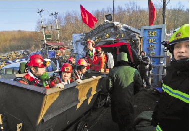 1月30日,在黑龙江省东宁县永盛煤矿气体中毒事故现场,救援人员乘坐矿车准备入井救援。1月29日10时30分,黑龙江省东宁县永盛煤矿发生气体中毒事故,据最新统计数据,该事故造成12人遇难,8人受伤。 新华社发
