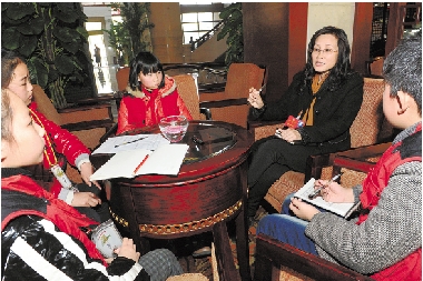在浙江宾馆委员驻地,小记者采访政协委员张丽霞。 本报记者 吴元峰 摄