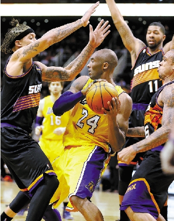 1月30日,湖人队球员科比(中)受到太阳队球员围夹。 新华社发