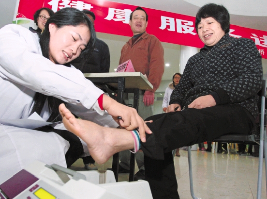 日前,宁波江北区庄桥街道社区卫生服务中心首站义诊在广庭社区举行,图为医生为居民做骨密度测试。 胡建华 阮天红 常虹 摄