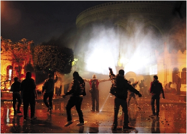 2月1日,在埃及首都开罗,示威者向总统府内的安全人员投掷石块。