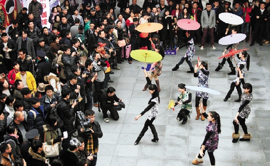 2月3日,由钱江晚报和省舞蹈家协会、杭州歌剧舞剧院联合主办的“温暖回家路”快闪活动启动。图为文艺工作者在杭州火车站为旅客表演节目。 本报记者 吴煌 摄