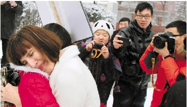 2月3日,在北京市朝阳区法院外,李金(左一)哭着与其支持者相拥。