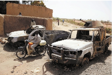 2月3日,在马里贾巴利,一名男子骑着摩托车从两辆在法军空袭中被烧毁的汽车旁经过。 新华社发