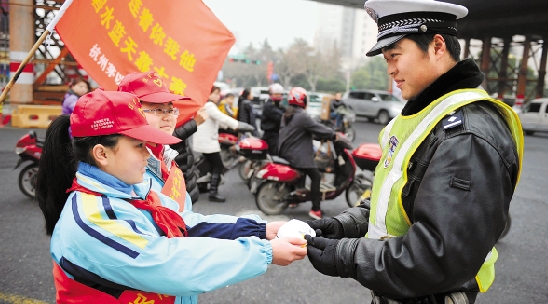 2月5日,杭州茅以升实验学校的同学寻访了浙大华家池校区PM2.5监测点,还为执勤的交警送上N95口罩,同时向市民发放“低碳环保”小卡片。 柳彬扬 摄