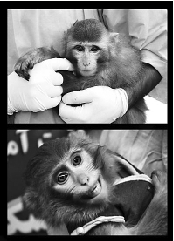 上图为伊朗公布的送入太空前的活猴照片。下图为1月30日新闻发布会上的猴子。 视野网供图
