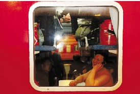 贵州毕节人龙金礼上车后,闷热难耐,索性脱掉上衣,向家人打电话报告平安上车。