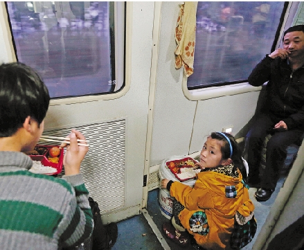 10元一份的快餐,让贵州大方县的小兰和哥哥吃得分外香,父亲则在一旁看着他们用餐。