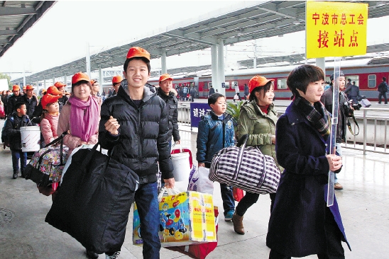 | 2月5日,140名安徽籍优秀外来务工者在宁波火车东站免费乘车。春运期间,宁波总工会等部门向2000名优秀外来务工者赠送返乡车票,帮助200多家企业集中网络订票,让近20万名外来务工者顺利踏上回家旅途。 胡建华 赵清 摄 |