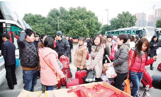 | 2月3日,在杭州汽车北站的发车点,7辆装饰一新的“快乐号”大巴车整装待发,司机和乘务员笑容满面地站立在上客门边,迎接“快乐号”大巴车的乘客。据悉,当天将有近400名外来务工人员凭“联合你我,快乐回家”活动赠送的免费车票,从汽车北站专门开辟的绿色通道进站,登上“快乐号”大巴车,向着家的方向出发。 “联合你我,快乐回家”杭州市2013春节外来务工人员平安返乡活动由杭州市总工会、杭州联合银行联合社会力量共同开展,由杭州联合银行出资百万送外来务工人员免费回家过年。活动自去年12月18日正式启动以来,引起了社会各界的广泛关注和积极参与,已送出了近5000张汽车票、火车票。据悉,除了为外来务工人员赠送车票,1月26日至2月9日,杭州联合银行还推出了柜面汇款零费用活动,所有外来务工人员至杭州联合银行网点柜面汇款,一律免收工本费、手续费,以让利形式让外来务工人员的返乡之旅更安心。 仇侃宁 文/摄 |