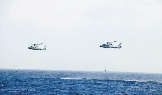 舰载直升机在南海海域吊放声纳进行反潜演练(2月2日摄)。 新华社记者 黎云 摄