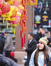 2月6日,几名市民在纽约曼哈顿的中国城观赏中国传统的春节挂饰。随着中国传统的新年临近,美国纽约中国城年味渐浓,鲜花和各种吉祥喜庆的新春挂饰拉开了迎接新年的序幕。