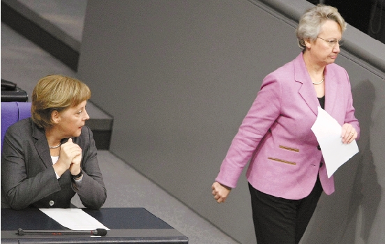 这是安妮特·沙范(右)在柏林德国联邦议院会议上准备登台发言的资料照片。 新华社发