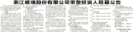 依照《中华人民共和国企业破产法》有关规定,浙江玻璃股份有限公司管理人面向全国,公开招募浙江玻璃股份有限公司重整投资人。就本次招募有关事项,现公告如下: