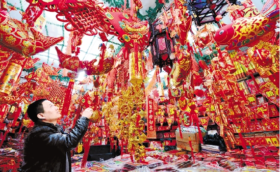 春节临近,在杭州汽车东站小商品市场,卖灯笼、花灯等节日用品的经营摊位生意红火。