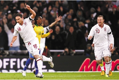 2月6日,在英国伦敦温布利球场举行的一场国际足球友谊赛中,英格兰队主场以2比1战胜巴西队。这场与“桑巴军团”的较量,是英格兰队在2013年的第一场比赛,也是英足总纪念其成立150周年的一项重要庆祝活动。图为英格兰队球员兰帕德(左)进球后与队友鲁尼(右)一起庆祝。 新华社发