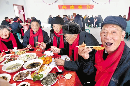 在武义南部山区的新宅镇敬老院,90多位大山里的孤寡老人穿着新衣服,共享由县慈善总会、县民政局、社会爱心人士组织的“慈善爱心年夜饭”。
