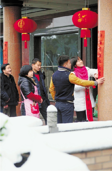 | 除夕贴春联,新年好光景。2月9日,雪后初晴,本报记者裘一佼(右)来到萧山所前镇金山村,为李水良一家送上春联。这一天,李家的“毛脚媳妇”(未过门的准儿媳)第一次上门。家有喜事,贴上春联、挂上灯笼,喜气洋洋过大年。 记者 董旭明 区委报道组 吕耀明 摄 |