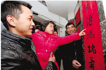| 上联:灵蛇飞舞大堰添瑞气 下联:快马加鞭山乡奔两富 横批:尽在掌握 赠送对象:奉化市大堰镇农户 大堰镇农户张贴和欣赏浙报记者童颖骏送去的春联。 毛节常 吴培维 摄 |