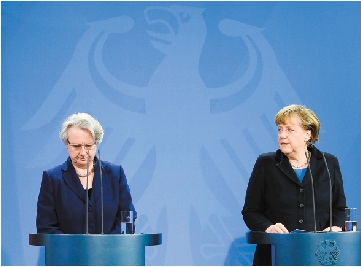 2月9日,德国总理默克尔(右)与德国教育和科研部长沙范共同出席在柏林举行的发布会。 新华社发