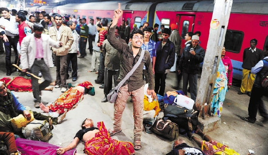 2月10日,在印度北部城市安拉阿巴德的火车站,一名遇难者家属情绪激动。 新华社发