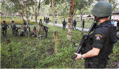 2月13日,泰国南部那拉提瓦府巴卓区的一个军事基地遭近百名武装人员袭击,双方发生交火,17名袭击者被打死。图为泰国军方人员在军事基地调查。 新华社发