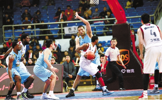 2月15日,CBA联赛浙江稠州队对新疆广汇队的比赛在义乌梅湖体育馆举行,浙江稠州队以99比121负于新疆广汇队。 本报记者 潘良干 摄