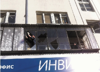 2月15日,在俄罗斯车里雅宾斯克,一名男子清理被陨石坠落带来的冲击波击碎的窗户。 新华社发