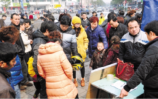 2月15日,在余杭经济开发区,招工单位一字摆开摊位,引来许多农民工。据了解,这些农民工以云南、安徽籍为多,过完年一回到杭州,放下包裹就来找工作。 本报记者 吴元峰 摄